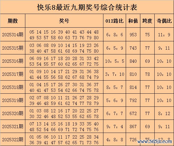 福彩沸腾8第2025322期开奖追思奖号:01 05 06 10 11 17 22 25 28 34 36 39 41 47 57 62 65 71 73 76,其中奖号奇偶比为12:8,012路比为4:8:8,和值为726,跨度为75。